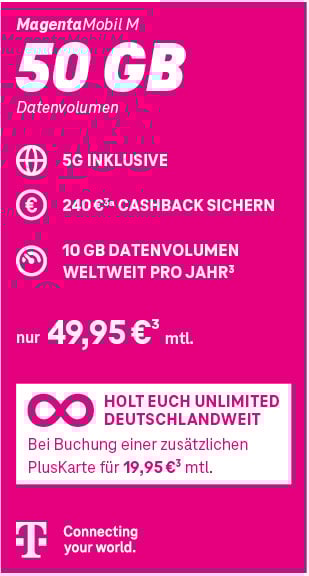 3) Im Aktionszeitraum 03.02. bis einschließlich 31.03.2026 erhalten Kunden bei Abschluss eines neuen Mobilfunk-Vertrags mit einer Mindestvertragslaufzeit von 24 Monaten mit oder ohne Endgerät einen Cashback in Höhe von 240 € gutgeschrieben (ausgeschlossen sind PlusKarten Tarife inkl. PlusKarte+, PlusKarte Kids & Teens und PlusKarte Data, Young Tarife, Special Tarife, DTAG-Tarife, for Friends Tarife und Datentarife). Z. B. MagentaMobil S für 39,95 €/Monat, einmaliger Bereitstellungspreis 39,95 €. Die Gutschrift ist nicht mit weiteren Aktionspromotions wie z. B. 6 Monate Grundpreisbefreiung kombinierbar. Zum Erhalt der Gutschrift (nach Ablauf der Widerrufsfrist) ist vom 03.03.–30.09.2026 eine Online-Registrierung über die MeinMagenta App (mit Klick auf Ihr Profil, „Cashback einlösen“) unter Vorlage der ersten Rechnung entsprechend den genannten Bedingungen erforderlich. Monatlicher Grundpreis beträgt 49,95 € (ohne Smartphone). Bereitstellungspreis 39,95 €. Mindestlaufzeit 24 Monate. Ab einem Datenvolumen von 50 GB wird die Bandbreite im jeweiligen Monat auf max. 64 KBit/s (Download) und 16 KBit/s