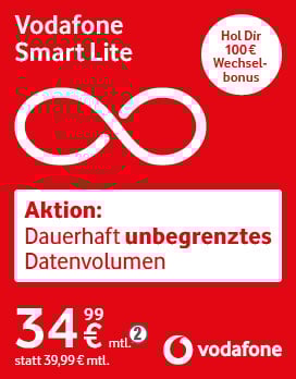 2) Smart Lite: Aktion Stand Februar 2026: mtl. Paketpreis 39,99 €. Mindestlaufzeit 24 Monate. Einmaliger Anschlusspreis 39,99 €. Du hast eine Flat für Standard-Gespräche in dt. Netze und eine SMS-Flat in dt. Mobilfunknetze. Sondernummern sind ausgeschlossen. Du surfst bis zu einem Datenvolumen von 30 GB/Mon. (statt 20 GB/Mon.) mit der jeweils größtmöglichen Bandbreite mit Vodafone. Bei Abschluss eines Smart Lite-Tarifes profitierst du kostenfrei und dauerhaft im Inland von der neuen 5G-Netz-Technologie. Um das 5G-Netz nutzen zu können, brauchst Du ein 5G-fähiges Gerät. 2 Bei Neuabschluss eines Mobilfunkvertrags oder einer Vertragsverlängerung im Smart 2022 Lite bekommst du unbegrenztes Datenvolumen fürs Surfen im deutschen Vodafone-Netz. Das zusätzliche Datenvolumen entfällt, wenn Du kündigst oder den Tarif wechselst. Bei einem Tarif mit unbegrenztem Datenvolumen kannst Du mit jeder Red+ Karte maximal bis zu 10 GB zuteilen. Fürs Surfen im EU-Ausland bekommst Du für den Smart Lite 70 GB. 3 Erhalte 100 € Wechselbonus, wenn Deine Aktivierung im Aktionszeitraum erfolgt. Deine Rufnummernportierung aus dem Vertrag muss innerhalb von 180 Tagen nach Tarifaktivierung erfolgen. Gilt nur, wenn für Deine zu portierende Rufnummer in den letzten 6 Monaten kein Vodafone Vertragsverhältnis bestand. Gilt nicht für Rufnummernportierungen aus anderen Tarifen/Verträgen der Vodafone GmbH. Die Gutschrift erfolgt frühstens 28 Tage nach Bestätigung des Portierungsdatums. Keine Barauszahlung möglich. 4 Du nutzt Deinen Vodafone-Tarif auch im EU-Ausland ohne Zusatzkosten wie zuhause. Das gilt für ankommende und abgehende Anrufe innerhalb der EU und nach Deutschland, für SMS und fürs Surfen. Gespräche zu Sondernummern, Anrufe und SMS von Deutschland ins EU-Ausland sind ausgeschlossen. Gilt nur auf vorübergehenden Reisen im EU-Ausland. 5 Falls Du in einem Rechnungszeitraum noch Datenvolumen übrig hast, übertragen wir es einmal in den nächsten Rechnungszeitraum. Du nutzt es dann automatisch, wenn Du Dein monatliches Datenvolumen verbraucht hast. Du kannst es auch in einer Red+ Gruppe nutzen. Nicht für Optionen, die zum Ende des Rechnungszeitraums auslaufen, z.B. SpeedFlex oder Mobile Internet Upgrades, und nicht bei sonstigen Daten-Aktionen. Wechselst Du Deinen Tarif, verfällt das übertragene Datenvolumen. 6 Du bekommst als Neukund:in 5 € Rabatt auf den monatlichen Tarifpreis. Der Rabatt entfällt, wenn Du kündigst oder den Tarif wechselst.