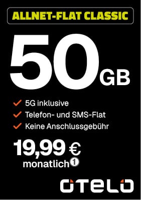 1) Basispreis 19,99 €/Monat. Mindestlaufzeit 24 Monate. Einmaliger Anschlusspreis 39,99 €. Im Tarif otelo Allnet-Flat Classic: 50 GB /Monat im dt. Netz. Max. 50 Mbit/s Download / 25 Mbit/s Upload, danach 64 kbit/s. Taktung 10 kB. Nicht genutztes Volumen verfällt am Monatsende. EU-Roaming nach Deutschland inklusive. Sprach-/SMS-Flat in dt. Netze (ohne Sonderrufnummern). 5G mit LTE 50 inklusive (bei 5G-fähigem Handy und Netzabdeckung, andernfalls 4G/LTE gemäß Tarif). Alle 5G-Standorte: otelo.de/5g. Weitere Infos: otelo Preisliste. Aktion Stand Oktober 2025: Neukunden erhalten eine Anschlusspreis-Erstattung bei Bestellung über teilnehmende Fachhändler und Aktivierung über die Mein otelo App. Details: otelo.de/app.