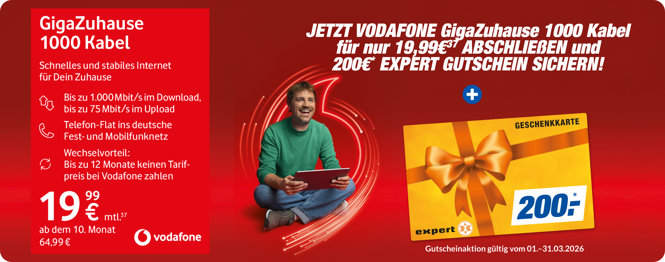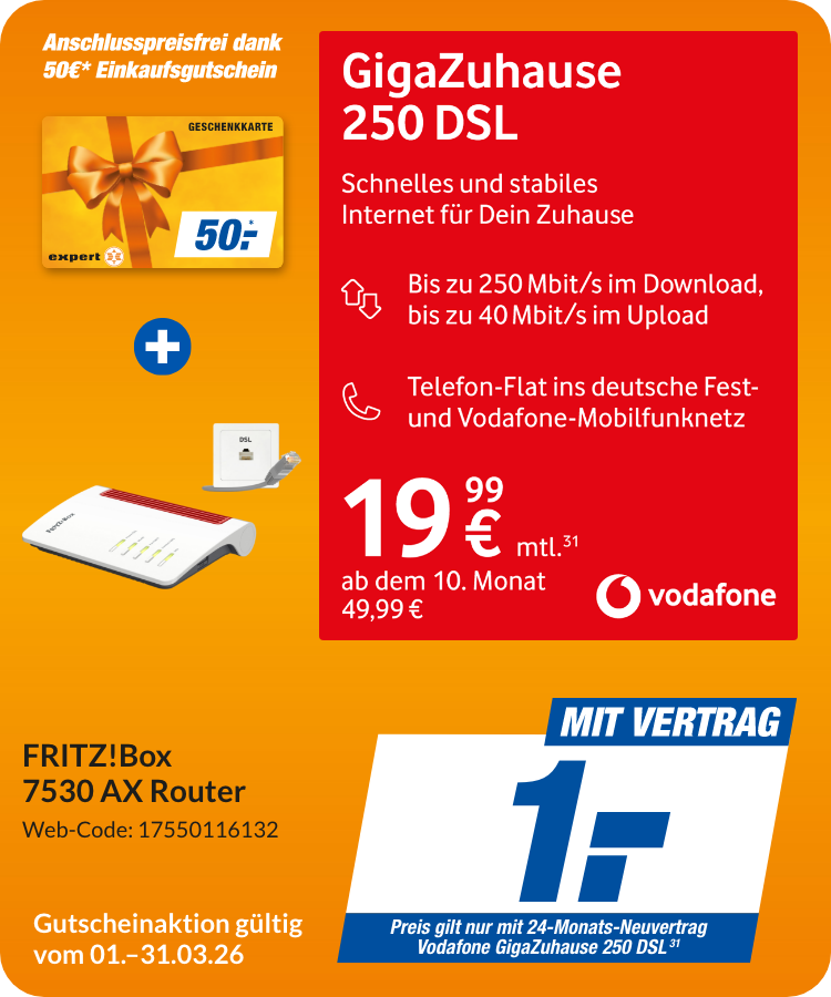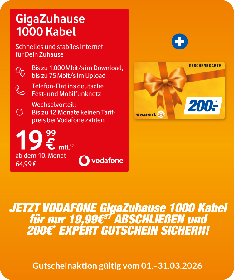 *Nur bei teilnehmenden expert Partnern. Regional kann es zu Abweichungen kommen. Es erfolgt keine Barauszahlung. Du erhältst einen expert Gutschein zur Verrechnung mit Deinen Wunschprodukten. Die Gutscheinausgabe findet nach Vorlage der ersten Vodafone-Rechnung statt.