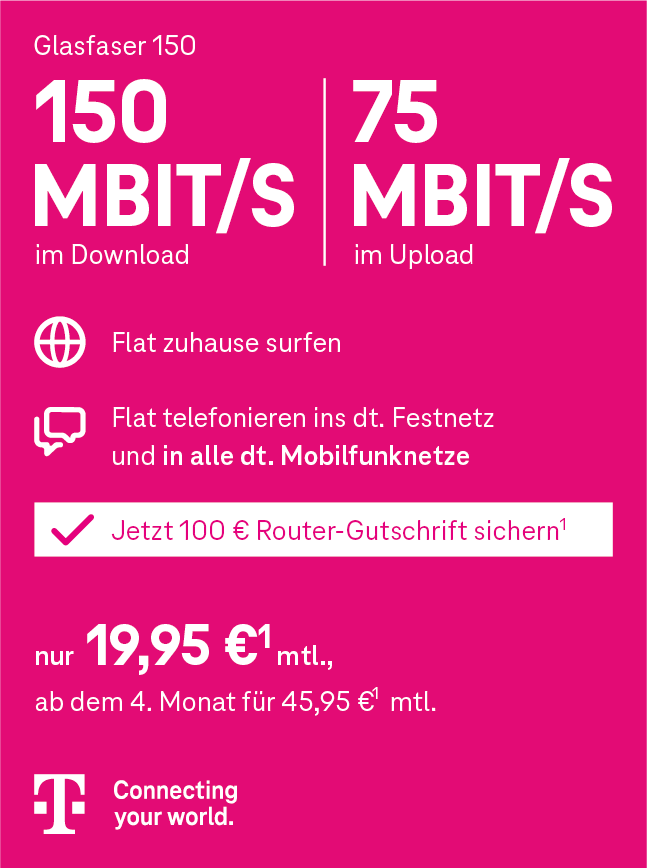 1 Aktion gilt bis 31.03.2026 für Breitband-Neukunden, die in den letzten 3 Monaten keinen Breitbandanschluss bei der Telekom hatten. Glasfaser 150 kostet in den ersten 3 Monaten 19,95 €/Monat, danach 45,95 €/Monat. Bei Miete eines Routers im Endgeräte-Service-Paket (i. H. v. 7,95 €/Monat) erfolgt eine Router-Gutschrift i. H. v. 100 €. Hardware zzgl. 6,95 € Versandkosten. Einmaliger Bereitstellungspreis für neuen Telefonanschluss 69,95 €. Die Mindestvertragslaufzeit für Glasfaser 150 beträgt 24 Monate, für Hardware 12 Monate. Für die Bereitstellung von Glasfaser 150 ist ein Glasfaser-Hausanschluss erforderlich. Sofern noch nicht vorhanden, wird dieser, mit der Ausnahme von Neubauten, bei verbindlicher Buchung des Tarifs Glasfaser 150 kostenfrei neu verlegt, vorausgesetzt, die Anschlussadresse für den Tarif ist mit der Adresse des mit Glasfaser anzuschließenden Gebäudes identisch. Bei Neubauten kostet die Bereitstellung eines Glasfaser-Hausanschlusses einmalig 999,95 €. Die Bereitstellung erfolgt, wenn Hauseigentümer/Hausverwaltung dem Ausbau zustimmen und die finale Prüfung den Ausbau bestätigt. Durch Eingabe der Adresse auf der Internetseite https://www.telekom.de/netz/glasfaser kann geprüft werden, ob diese in einem Glasfaser-Ausbaugebiet der Deutschen Telekom liegt. Alle Preise inkl. der gesetzlichen MwSt. Ein Angebot von: Telekom Deutschland GmbH, Landgrabenweg 149, 53227 Bonn.