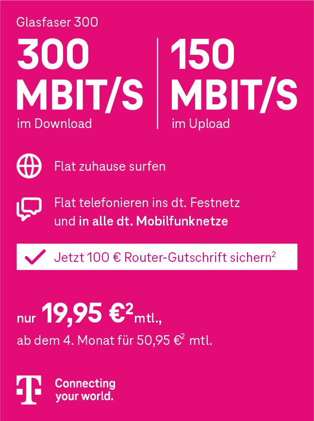 2 Aktion gilt bis 31.03.2026 für Breitband-Neukunden, die in den letzten 3 Monaten keinen Breitbandanschluss bei der Telekom hatten. Glasfaser 300 kostet in den ersten 3 Monaten 19,95 €/Monat, danach 50,95 €/Monat. Bei Miete eines Routers im Endgeräte-Service-Paket (i. H. v. 7,95 €/Monat) erfolgt eine Router-Gutschrift i. H. v. 100 €. Hardware zzgl. 6,95 € Versandkosten. Einmaliger Bereitstellungspreis für neuen Telefonanschluss 69,95 €. Die Mindestvertragslaufzeit für Glasfaser 300 beträgt 24 Monate, für Hardware 12 Monate. Für die Bereitstellung von Glasfaser 300 ist ein Glasfaser-Hausanschluss erforderlich. Sofern noch nicht vorhanden, wird dieser, mit der Ausnahme von Neubauten, bei verbindlicher Buchung des Tarifs Glasfaser 300 kostenfrei neu verlegt, vorausgesetzt, die Anschlussadresse für den Tarif ist mit der Adresse des mit Glasfaser anzuschließenden Gebäudes identisch. Bei Neubauten kostet die Bereitstellung eines Glasfaser-Hausanschlusses einmalig 999,95 €. Die Bereitstellung erfolgt, wenn Hauseigentümer/Hausverwaltung dem Ausbau zustimmen und die finale Prüfung den Ausbau bestätigt. Durch Eingabe der Adresse auf der Internetseite https://www.telekom.de/netz/glasfaser kann geprüft werden, ob diese in einem Glasfaser-Ausbaugebiet der Deutschen Telekom liegt. Alle Preise inkl. der gesetzlichen MwSt. Ein Angebot von: Telekom Deutschland GmbH, Landgrabenweg 149, 53227 Bonn.