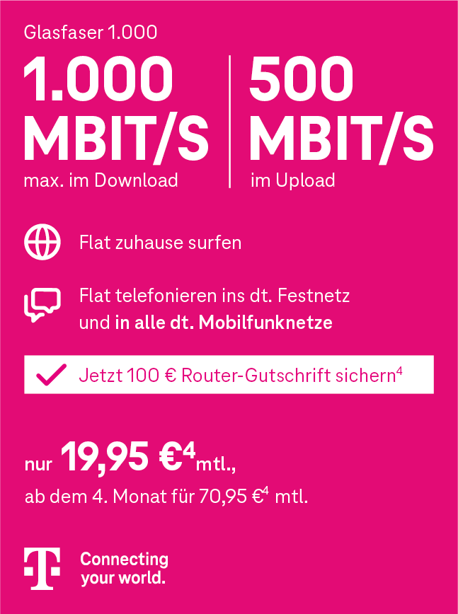 4 Aktion gilt bis 31.03.2026 für Breitband-Neukunden, die in den letzten 3 Monaten keinen Breitbandanschluss bei der Telekom hatten. Glasfaser 1.000 kostet in den ersten 3 Monaten 19,95 €/Monat, danach 70,95 €/Monat. Bei Miete eines Routers im Endgeräte-Service-Paket (i. H. v. 7,95 €/Monat) erfolgt eine Router-Gutschrift i. H. v. 100 €. Hardware zzgl. 6,95 € Versandkosten. Einmaliger Bereitstellungspreis für neuen Telefonanschluss 69,95 €. Die Mindestvertragslaufzeit für Glasfaser 1.000 beträgt 24 Monate, für Hardware 12 Monate. Für die Bereitstellung von Glasfaser 1.000 ist ein Glasfaser-Hausanschluss erforderlich. Sofern noch nicht vorhanden, wird dieser, mit der Ausnahme von Neubauten, bei verbindlicher Buchung des Tarifs Glasfaser 1.000 kostenfrei neu verlegt, vorausgesetzt, die Anschluss-adresse für den Tarif ist mit der Adresse des mit Glasfaser anzuschließenden Gebäudes identisch. Bei Neubauten kostet die Bereitstellung eines Glasfaser-Hausanschlusses einmalig 999,95 €. Die Bereitstellung erfolgt, wenn Hauseigentümer/Hausverwaltung dem Ausbau zustimmen und die finale Prüfung den Ausbau bestätigt. Durch Eingabe der Adresse auf der Internetseite https://www.telekom.de/netz/glasfaser kann geprüft werden, ob diese in einem Glasfaser-Ausbaugebiet der Deutschen Telekom liegt. Alle Preise inkl. der gesetzlichen MwSt. Ein Angebot von: Telekom Deutschland GmbH, Landgrabenweg 149, 53227 Bonn.