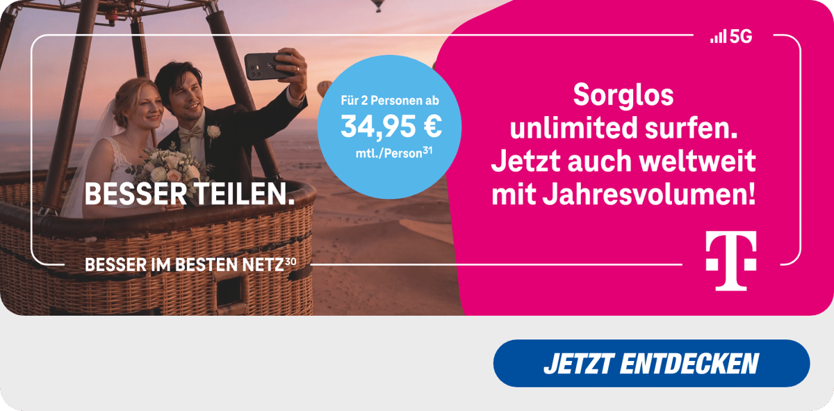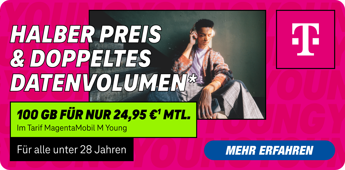 1 Monatlicher Grundpreis beträgt in den ersten 24 Monaten 24,95 € (ohne Smartphone) und ab dem 25. Monat 39,95 € (ohne Smartphone). Mindestalter 18 Jahre, Höchstalter 27 Jahre. Ab dem Monat, der auf die Vollendung des 28. Lebensjahrs folgt, frühestens jedoch mit dem Ende der Mindestvertragslaufzeit, entfällt der Young-Vorteil und MagentaMobil M Young wird zu den Konditionen des entsprechenden MagentaMobil Tarifs fortgeführt. Bereitstellungspreis 39,95 €. Mindestlaufzeit 24 Monate. Ab einem Datenvolumen von 100 GB wird die Bandbreite im jeweiligen Monat auf max. 64 KBit/s (Download) und 16 KBit/s (Upload) beschränkt.