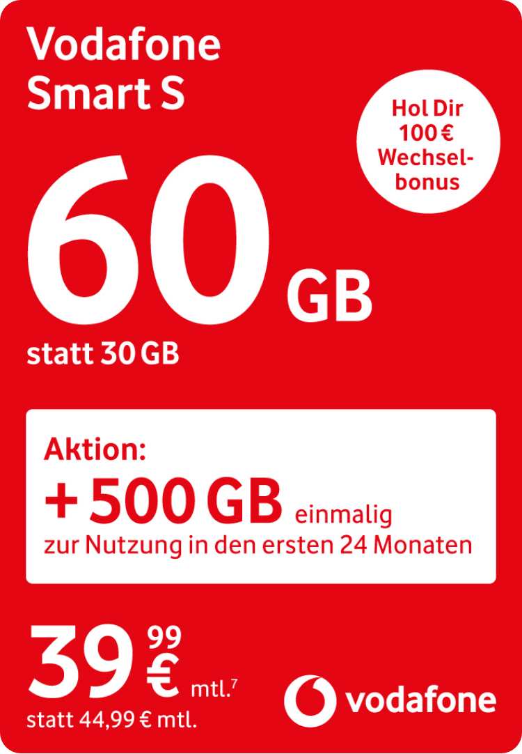 Aktion Stand Dezember 2025: mtl. Paketpreis statt 44,99 €. Mindestlaufzeit 24 Monate. Einmaliger Anschlusspreis 39,99 €. Du hast eine Flat für Standard-Gespräche in deutsche Netze und eine SMS-Flat in deutsche Mobilfunknetze. Sondernummern sind davon ausgeschlossen. Du surfst bis zu einem Datenvolumen von 60 GB/Mon. (statt 30 GB/Mon.) mit der jeweils größtmöglichen Bandbreite mit Vodafone. Bei Abschluss eines Smart S-Tarifes profitierst du kostenfrei und dauerhaft im Inland von der neuen 5G-Netz-Technologie. Um das 5G-Netz nutzen zu können, brauchst Du ein 5G-fähiges Gerät. 2 Erhalte 100 € Wechselbonus, wenn Deine Aktivierung im Aktionszeitraum erfolgt. Deine Rufnummernportierung aus dem Vertrag muss innerhalb von 180 Tagen nach Tarifaktivierung erfolgen. Gilt nur, wenn für Deine zu portierende Rufnummer in den letzten 6 Monaten kein Vodafone Vertragsverhältnis bestand. Gilt nicht für Rufnummernportierungen aus anderen Tarifen/Verträgen der Vodafone GmbH. Die Gutschrift erfolgt frühstens 28 Tage nach Bestätigung des Portierungsdatums. Keine Barauszahlung möglich. 3 Bei Neuabschluss oder Vertragsverlängerung eines Mobilfunkvertrages im Tarif Smart Entry, Lite, S, M, L, XL oder XXL bekommst Du einmalig 500 GB im Inland und 100 GB im EU-Ausland für die gesamte Vertragslaufzeit (24 Monate) zusätzliches Datenvolumen. Das Datenpaket steht nach dem Verbrauch des Tarifinklusivvolumens zur Verfügung. 4 Du nutzt Deinen Vodafone-Tarif auch im EU-Ausland ohne Zusatzkosten wie zuhause. Das gilt für ankommende und abgehende Anrufe innerhalb der EU und nach Deutschland, für SMS und fürs Surfen. Gespräche zu Sondernummern, Anrufe und SMS von Deutschland ins EU-Ausland sind ausgeschlossen. Gilt nur auf vorübergehenden Reisen im EU-Ausland. 5 Falls Du in einem Rechnungszeitraum noch Datenvolumen übrig hast, übertragen wir es einmal in den nächsten Rechnungszeitraum. Du nutzt es dann automatisch, wenn Du Dein monatliches Datenvolumen verbraucht hast. Du kannst es auch in einer Red+ Gruppe nutzen. Nicht für Optionen, die zum Ende des Rechnungszeitraums auslaufen, z.B. SpeedFlex oder Mobile Internet Upgrades, und nicht bei sonstigen Daten-Aktionen. Wechselst Du Deinen Tarif, verfällt das übertragene Datenvolumen. 6 Du bekommst als Neukund:in 5 € Rabatt auf den monatlichen Tarifpreis. Der Rabatt entfällt, wenn Du kündigst oder den Tarif wechselst.