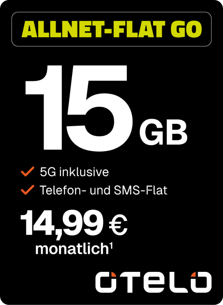 Basispreis 14,99 € pro Monat. Mindestlaufzeit 24 Monate. Einmaliger Anschlusspreis 39,99 €. Fürs Surfen im deutschen Vodafone-Netz hast Du ein Inklusivvolumen von 15 GB im Tarif otelo Allnet-Flat Go pro Abrechnungszeitraum. Zusätzlich bekommst Du eine Sprach- und SMS-Flat in alle dt. Netze (keine Sonderrufnummern). 5G inklusive: In den Tarifen oteloAllnet-Flat Go, otelo Allnet-Flat Classic und otelo Allnet-Flat Max: Erhalte 5G mit LTE 50 inklusive. An 5G-Standorten kannst Du mit 5G-fähiges Handy im 5G-Netz surfen. An anderen Standorten surfst Du in 4G. Du surfst mit der Geschwindigkeit deines zugrundeliegenden Tarifes. Alle 5G-Standorte findest du auf otelo.de/5g.