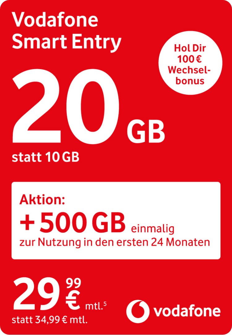 Aktion Stand Dezember 2025: mtl. Paketpreis 34,99 €, Mindestlaufzeit 24 Monate, einmaliger Anschlusspreis 39,99 €. Du hast eine Flat für Standard-Gespräche in deutsche Netze und eine SMS-Flat in deutsche Mobilfunknetze. Sondernummern sind davon ausgeschlossen. Du surfst bis zu einem Datenvolumen von 20 GB/Mon. (statt 10 GB/Mon.) mit der jeweils größtmöglichen Bandbreite mit Vodafone. Bei Abschluss eines Smart Entry-Tarifes profitierst du kostenfrei und dauerhaft im Inland von der neuen 5G-Netz-Technologie. Um das 5G-Netz nutzen zu können, brauchst Du ein 5G-fähiges Gerät. 2 Erhalte 100 € Wechselbonus, wenn Deine Aktivierung im Aktionszeitraum erfolgt. Deine Rufnummernportierung aus dem Vertrag muss innerhalb von 180 Tagen nach Tarifaktivierung erfolgen. Gilt nur, wenn für Deine zu portierende Rufnummer in den letzten 6 Monaten kein Vodafone Vertragsverhältnis bestand. Gilt nicht für Rufnummernportierungen aus anderen Tarifen/Verträgen der Vodafone GmbH. Die Gutschrift erfolgt frühstens 28 Tage nach Bestätigung des Portierungsdatums. Keine Barauszahlung möglich. 3 Bei Neuabschluss oder Vertragsverlängerung eines Mobilfunkvertrages im Tarif Smart Entry, Lite, S, M, L, XL oder XXL bekommst Du einmalig 500 GB im Inland und 100 GB im EU-Ausland für die gesamte Vertragslaufzeit (24 Monate) zusätzliches Datenvolumen. Das Datenpaket steht nach dem Verbrauch des Tarifinklusivvolumens zur Verfügung. 4 Du nutzt Deinen Vodafone-Tarif auch im EU-Ausland ohne Zusatzkosten wie zuhause. Das gilt für ankommende und abgehende Anrufe innerhalb der EU und nach Deutschland, für SMS und fürs Surfen. Gespräche zu Sondernummern, Anrufe und SMS von Deutschland ins EU-Ausland sind ausgeschlossen. Gilt nur auf vorübergehenden Reisen im EU-Ausland. 5 Falls Du in einem Rechnungszeitraum noch Datenvolumen übrighast, übertragen wir es einmal in den nächsten Rechnungszeitraum. Du nutzt es dann automatisch, wenn Du Dein monatliches Datenvolumen verbraucht hast. Du kannst es auch in einer Red+ Gruppe nutzen. Nicht für Optionen, die zum Ende des Rechnungszeitraums auslaufen, z.B. SpeedFlex oder Mobile Internet Upgrades, und nicht bei sonstigen Daten-Aktionen. Wechselst Du Deinen Tarif, verfällt das übertragene Datenvolumen. 6 Du bekommst als Neukund:in 5 € Rabatt auf den monatlichen Tarifpreis. Der Rabatt entfällt, wenn Du kündigst oder den Tarif wechselst.
