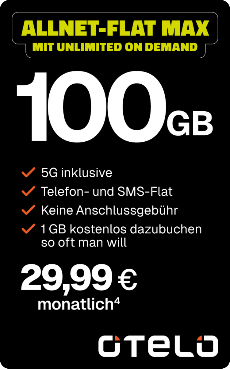 Basispreis 29,99 € pro Monat. Mindestlaufzeit 24 Monate. Einmaliger Anschlusspreis 39,99 €. Im Basispreis enthalten ist ein Datenvolumen mit mtl. 100 GB (statt 60 GB). Nach Verbrauch der 100 GB kann beliebig oft weiteres Datenvolumen in Schritten von jeweils 1 GB über die Mein otelo App nachgebucht werden. Max. 50 Mbit/s Download / 25 Mbit/s Upload, danach 64 kbit/s. Taktung 10 kB. Nicht genutztes Volumen verfällt am Monatsende.Innerhalb des EU- Auslands inkl. nach Deutschland sind 100 GB nutzbar. Sprach-/SMS-Flat in dt. Netze (ohne Sonderrufnummern). 5G mit LTE 50 inklusive (bei 5G-fähigem Handy und Netzabdeckung, andernfalls 4G/LTE gemäß Tarif). Alle 5G-Standorte: otelo.de/5g. Weitere Infos: otelo Preisliste. Aktion Stand Oktober 2025: Neukunden erhalten eine Anschlusspreis-Erstattung bei Bestellung über teilnehmende Fachhändler und Aktivierung über die Mein otelo App. Details: otelo.de/app.
