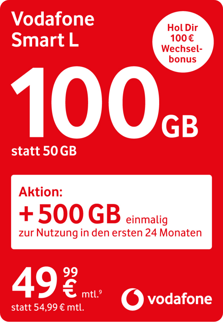 Aktion Stand Dezember 2025: mtl. Paketpreis 54,99 €. Mindestlaufzeit 24 Monate. Einmaliger Anschlusspreis 39,99 €. Du hast eine Flat für Standard-Gespräche in deutsche Netze und eine SMS-Flat in deutsche Mobilfunknetze. Sondernummern sind davon ausgeschlossen. Du surfst bis zu einem Datenvolumen von 100 GB/Mon. (statt 50 GB/Mon.) mit der jeweils größtmöglichen Bandbreite mit Vodafone. Bei Abschluss eines Smart L-Tarifes profitierst du kostenfrei und dauerhaft im Inland von der neuen 5G-Netz-Technologie. Um das 5G-Netz nutzen zu können, brauchst Du ein 5G-fähiges Gerät. 2 Erhalte 100 € Wechselbonus, wenn Deine Aktivierung im Aktionszeitraum erfolgt. Deine Rufnummernportierung aus dem Vertrag muss innerhalb von 180 Tagen nach Tarifaktivierung erfolgen. Gilt nur, wenn für Deine zu portierende Rufnummer in den letzten 6 Monaten kein Vodafone Vertragsverhältnis bestand. Gilt nicht für Rufnummernportierungen aus anderen Tarifen/Verträgen der Vodafone GmbH. Die Gutschrift erfolgt frühstens 28 Tage nach Bestätigung des Portierungsdatums. Keine Barauszahlung möglich. 3 Bei Neuabschluss oder Vertragsverlängerung eines Mobilfunkvertrages im Tarif Smart Entry, Lite, S, M, L, XL oder XXL bekommst Du einmalig 500 GB im Inland und 100 GB im EU-Ausland für die gesamte Vertragslaufzeit (24 Monate) zusätzliches Datenvolumen. Das Datenpaket steht nach dem Verbrauch des Tarifinklusivvolumens zur Verfügung. 4 Du nutzt Deinen Vodafone-Tarif auch im EU-Ausland ohne Zusatzkosten wie zuhause. Das gilt für ankommende und abgehende Anrufe innerhalb der EU und nach Deutschland, für SMS und fürs Surfen. Gespräche zu Sondernummern, Anrufe und SMS von Deutschland ins EU-Ausland sind ausgeschlossen. Gilt nur auf vorübergehenden Reisen im EU-Ausland. 5 Falls Du in einem Rechnungszeitraum noch Datenvolumen übrig hast, übertragen wir es einmal in den nächsten Rechnungszeitraum. Du nutzt es dann automatisch, wenn Du Dein monatliches Datenvolumen verbraucht hast. Du kannst es auch in einer Red+ Gruppe nutzen. Nicht für Optionen, die zum Ende des Rechnungszeitraums auslaufen, z.B. SpeedFlex oder Mobile Internet Upgrades, und nicht bei sonstigen Daten-Aktionen. Wechselst Du Deinen Tarif, verfällt das übertragene Datenvolumen. 6 Du bekommst als Neukund:in 5 € Rabatt auf den monatlichen Tarifpreis. Der Rabatt entfällt, wenn Du kündigst oder den Tarif wechselst.