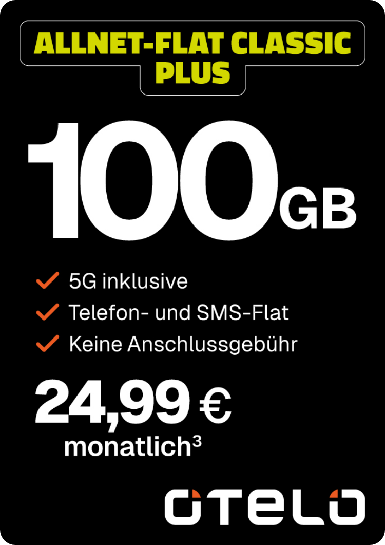 Basispreis 24,99 €/Monat. Mindestlaufzeit 24 Monate. Einmaliger Anschlusspreis 39,99 €. Im Tarif otelo Allnet-Flat Classic Plus: 100 GB /Monat im dt. Netz. Max. 50 Mbit/s Download / 25 Mbit/s Upload, danach 64 kbit/s. Taktung 10 kB. Nicht genutztes Volumen verfällt am Monatsende. EU-Roaming nach Deutschland inklusive. Sprach-/SMS-Flat in dt. Netze (ohne Sonderrufnummern). 5G mit LTE 50 inklusive (bei 5G-fähigem Handy und Netzabdeckung, andernfalls 4G/LTE gemäß Tarif). Alle 5G-Standorte: otelo.de/5g. Weitere Infos: otelo Preisliste. Aktion Stand Oktober 2025: Neukunden erhalten eine Anschlusspreis-Erstattung bei Bestellung über teilnehmende Fachhändler und Aktivierung über die Mein otelo App. Details: otelo.de/app.