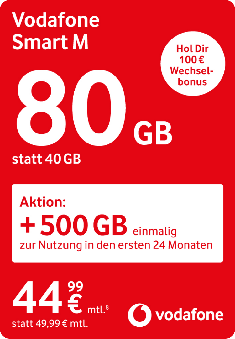 Aktion Stand Dezember 2025: mtl. Paketpreis 49,99 €. Mindestlaufzeit 24 Monate. Einmaliger Anschlusspreis 39,99 €. Du hast eine Flat für Standard-Gespräche in deutsche Netze und eine SMS-Flat in deutsche Mobilfunknetze. Sondernummern sind davon ausgeschlossen. Du surfst bis zu einem Datenvolumen von 80 GB/Mon. (statt 40 GB/Mon.) mit der jeweils größtmöglichen Bandbreite mit Vodafone. Bei Abschluss eines Smart M-Tarifes profitierst du kostenfrei und dauerhaft im Inland von der neuen 5G-Netz-Technologie. Um das 5G-Netz nutzen zu können, brauchst Du ein 5G-fähiges Gerät. 2 Erhalte 100 € Wechselbonus, wenn Deine Aktivierung im Aktionszeitraum erfolgt. Deine Rufnummernportierung aus dem Vertrag muss innerhalb von 180 Tagen nach Tarifaktivierung erfolgen. Gilt nur, wenn für Deine zu portierende Rufnummer in den letzten 6 Monaten kein Vodafone Vertragsverhältnis bestand. Gilt nicht für Rufnummernportierungen aus anderen Tarifen/Verträgen der Vodafone GmbH. Die Gutschrift erfolgt frühstens 28 Tage nach Bestätigung des Portierungsdatums. Keine Barauszahlung möglich. 3 Bei Neuabschluss oder Vertragsverlängerung eines Mobilfunkvertrages im Tarif Smart Entry, Lite, S, M, L, XL oder XXL bekommst Du einmalig 500 GB im Inland und 100 GB im EU-Ausland für die gesamte Vertragslaufzeit (24 Monate) zusätzliches Datenvolumen. Das Datenpaket steht nach dem Verbrauch des Tarifinklusivvolumens zur Verfügung. 4 Du nutzt Deinen Vodafone-Tarif auch im EU-Ausland ohne Zusatzkosten wie zuhause. Das gilt für ankommende und abgehende Anrufe innerhalb der EU und nach Deutschland, für SMS und fürs Surfen. Gespräche zu Sondernummern, Anrufe und SMS von Deutschland ins EU-Ausland sind ausgeschlossen. Gilt nur auf vorübergehenden Reisen im EU-Ausland. 5 Falls Du in einem Rechnungszeitraum noch Datenvolumen übrig hast, übertragen wir es einmal in den nächsten Rechnungszeitraum. Du nutzt es dann automatisch, wenn Du Dein monatliches Datenvolumen verbraucht hast. Du kannst es auch in einer Red+ Gruppe nutzen. Nicht für Optionen, die zum Ende des Rechnungszeitraums auslaufen, z.B. SpeedFlex oder Mobile Internet Upgrades, und nicht bei sonstigen Daten-Aktionen. Wechselst Du Deinen Tarif, verfällt das übertragene Datenvolumen. 6 Du bekommst als Neukund:in 5 € Rabatt auf den monatlichen Tarifpreis. Der Rabatt entfällt, wenn Du kündigst oder den Tarif wechselst.