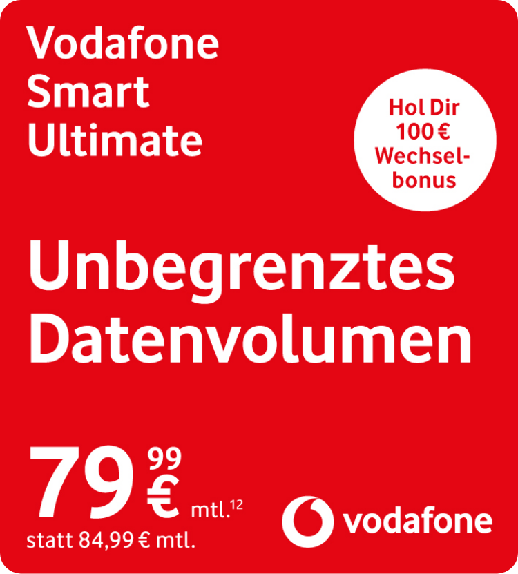 Aktion Stand Januar 2025: mtl. Paketpreis 84,99 €. Mindestlaufzeit 24 Monate. Einmaliger Anschlusspreis 39,99 €. Du hast eine Flat für Standard-Gespräche in deutsche Netze und eine SMS-Flat in deutsche Mobilfunknetze. Sondernummern sind davon ausgeschlossen. Du hast unbegrenztes Datenvolumen fürs Surfen im deutschen Vodafone-Netz. Bei Abschluss eines Smart Ultimate-Tarifes profitierst du kostenfrei und dauerhaft im Inland von der neuen 5G-Netz-Technologie. Um das 5G-Netz nutzen zu können, brauchst Du ein 5G-fähiges Gerät. Fürs Surfen im EU-Ausland hast Du im Tarif Smart Ultimate ein Datenvolumen von 110 GB, nach Verbrauch kostet ein MB 0,15 Cent. Die Abrechnung erfolgt kilobytegenau. 2 Aktion Stand April 2025: Erhalte 100 € Wechselbonus, wenn Deine Aktivierung im Aktionszeitraum erfolgt. Deine Rufnummernportierung aus dem Vertrag muss innerhalb von 180 Tagen nach Tarifaktivierung erfolgen. Gilt nur, wenn für Deine zu portierende Rufnummer in den letzten 6 Monaten kein Vodafone Vertragsverhältnis bestand. Gilt nicht für Rufnummernportierungen aus anderen Tarifen/Verträgen der Vodafone GmbH. Die Gutschrift erfolgt frühstens 28 Tage nach Bestätigung des Portierungsdatums. Keine Barauszahlung möglich. 3 Du nutzt Deinen Vodafone-Tarif auch im EU-Ausland ohne Zusatzkosten wie zuhause. Das gilt für ankommende und abgehende Anrufe innerhalb der EU und nach Deutschland, für SMS und fürs Surfen. Gespräche zu Sondernummern, Anrufe und SMS von Deutschland ins EU-Ausland sind ausgeschlossen. Gilt nur auf vorübergehenden Reisen im EU-Ausland. 4 Falls Du in einem Rechnungszeitraum noch Datenvolumen übrig hast, übertragen wir es einmal in den nächsten Rechnungszeitraum. Du nutzt es dann automatisch, wenn Du Dein monatliches Datenvolumen verbraucht hast. Du kannst es auch in einer Red+ Gruppe nutzen. Nicht für Optionen, die zum Ende des Rechnungszeitraums auslaufen, z.B. SpeedFlex oder Mobile Internet Upgrades, und nicht bei sonstigen Daten-Aktionen. Wechselst Du Deinen Tarif, verfällt das übertragene Datenvolumen. 5 Aktion Stand September 2024: Du bekommst als Neukund:in 5 € Rabatt auf den monatlichen Tarifpreis. Der Rabatt entfällt, wenn Du kündigst oder den Tarif wechselst.