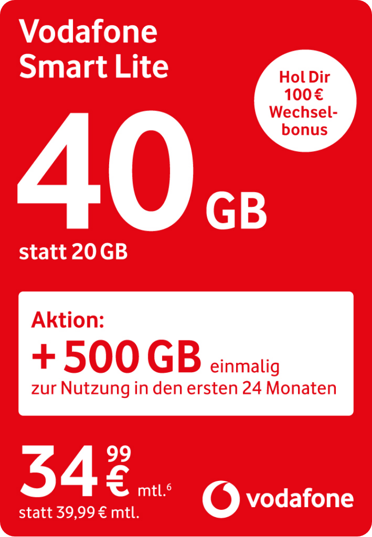 Aktion Stand Dezember 2025: mtl. Paketpreis 39,99 €. Mindestlaufzeit 24 Monate. Einmaliger Anschlusspreis 39,99 €. Du hast eine Flat für Standard-Gespräche in dt. Netze und eine SMS-Flat in dt. Mobilfunknetze. Sondernummern sind ausgeschlossen. Du surfst bis zu einem Datenvolumen von 40 GB/Mon. (statt 20 GB/Mon.) mit der jeweils größtmöglichen Bandbreite mit Vodafone. Bei Abschluss eines Smart Lite-Tarifes profitierst du kostenfrei und dauerhaft im Inland von der neuen 5G-Netz-Technologie. Um das 5G-Netz nutzen zu können, brauchst Du ein 5G-fähiges Gerät. 2 Erhalte 100 € Wechselbonus, wenn Deine Aktivierung im Aktionszeitraum erfolgt. Deine Rufnummernportierung aus dem Vertrag muss innerhalb von 180 Tagen nach Tarifaktivierung erfolgen. Gilt nur, wenn für Deine zu portierende Rufnummer in den letzten 6 Monaten kein Vodafone Vertragsverhältnis bestand. Gilt nicht für Rufnummernportierungen aus anderen Tarifen/Verträgen der Vodafone GmbH. Die Gutschrift erfolgt frühstens 28 Tage nach Bestätigung des Portierungsdatums. Keine Barauszahlung möglich. 3 Bei Neuabschluss oder Vertragsverlängerung eines Mobilfunkvertrages im Tarif Smart Entry, Lite, S, M, L, XL oder XXL bekommst Du einmalig 500 GB im Inland und 100 GB im EU-Ausland für die gesamte Vertragslaufzeit (24 Monate) zusätzliches Datenvolumen. Das Datenpaket steht nach dem Verbrauch des Tarifinklusivvolumens zur Verfügung. 4 Du nutzt Deinen Vodafone-Tarif auch im EU-Ausland ohne Zusatzkosten wie zuhause. Das gilt für ankommende und abgehende Anrufe innerhalb der EU und nach Deutschland, für SMS und fürs Surfen. Gespräche zu Sondernummern, Anrufe und SMS von Deutschland ins EU-Ausland sind ausgeschlossen. Gilt nur auf vorübergehenden Reisen im EU-Ausland. 5 Falls Du in einem Rechnungszeitraum noch Datenvolumen übrig hast, übertragen wir es einmal in den nächsten Rechnungszeitraum. Du nutzt es dann automatisch, wenn Du Dein monatliches Datenvolumen verbraucht hast. Du kannst es auch in einer Red+ Gruppe nutzen. Nicht für Optionen, die zum Ende des Rechnungszeitraums auslaufen, z.B. SpeedFlex oder Mobile Internet Upgrades, und nicht bei sonstigen Daten-Aktionen. Wechselst Du Deinen Tarif, verfällt das übertragene Datenvolumen. 6 Du bekommst als Neukund:in 5 € Rabatt auf den monatlichen Tarifpreis. Der Rabatt entfällt, wenn Du kündigst oder den Tarif wechselst.