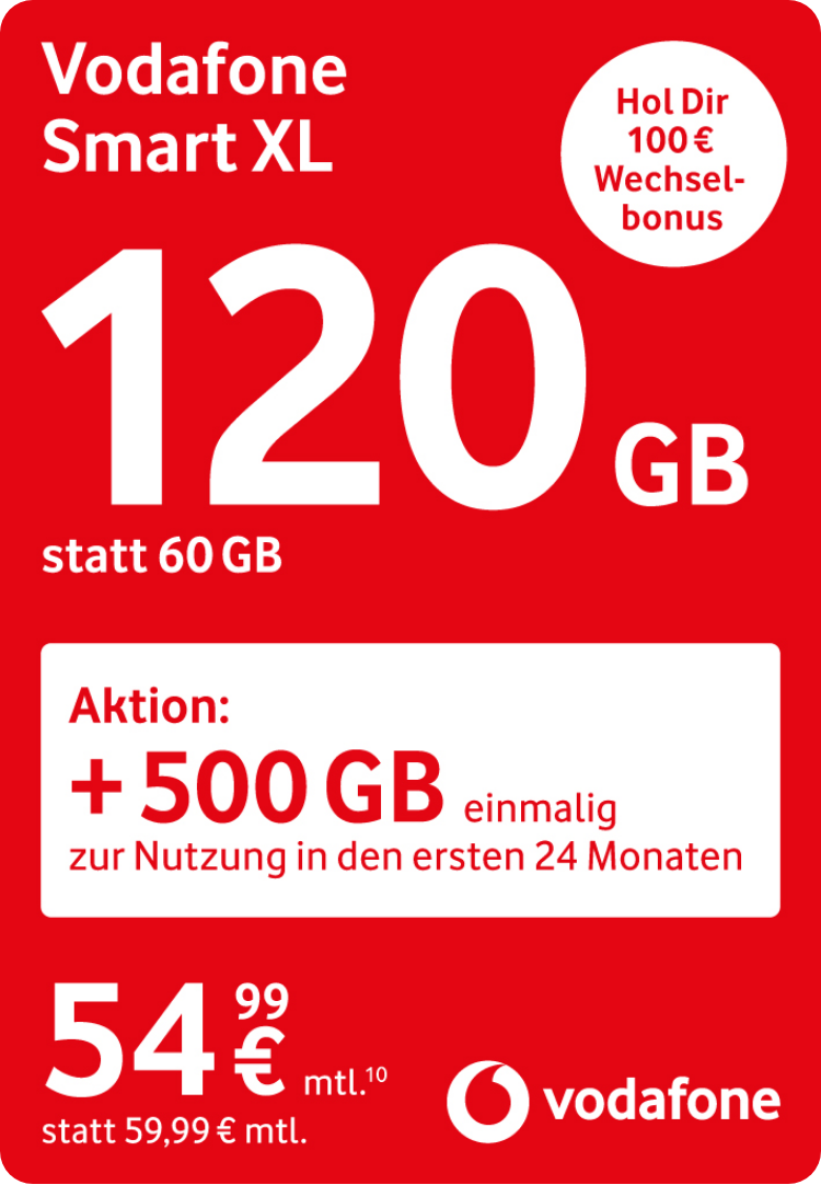 10 Smart XL: Aktion Stand Dezember 2025: mtl. Paketpreis 59,99 €. Mindestlaufzeit 24 Monate. Einmaliger Anschlusspreis 39,99 €. Du hast eine Flat für Standard-Gespräche in deutsche Netze und eine SMS-Flat in deutsche Mobilfunknetze. Sondernummern sind davon ausgeschlossen. Du surfst bis zu einem Datenvolumen von 120 GB/Mon. (statt 60 GB/Mon.) mit der jeweils größtmöglichen Bandbreite mit Vodafone. Bei Abschluss eines Smart XL-Tarifes profitierst du kostenfrei und dauerhaft im Inland von der neuen 5G-Netz-Technologie. Um das 5G-Netz nutzen zu können, brauchst Du ein 5G-fähiges Gerät. 2 Erhalte 100 € Wechselbonus, wenn Deine Aktivierung im Aktionszeitraum erfolgt. Deine Rufnummernportierung aus dem Vertrag muss innerhalb von 180 Tagen nach Tarifaktivierung erfolgen. Gilt nur, wenn für Deine zu portierende Rufnummer in den letzten 6 Monaten kein Vodafone Vertragsverhältnis bestand. Gilt nicht für Rufnummernportierungen aus anderen Tarifen/Verträgen der Vodafone GmbH. Die Gutschrift erfolgt frühstens 28 Tage nach Bestätigung des Portierungsdatums. Keine Barauszahlung möglich. 3 Bei Neuabschluss oder Vertragsverlängerung eines Mobilfunkvertrages im Tarif Smart Entry, Lite, S, M, L, XL oder XXL bekommst Du einmalig 500 GB im Inland und 100 GB im EU-Ausland für die gesamte Vertragslaufzeit (24 Monate) zusätzliches Datenvolumen. Das Datenpaket steht nach dem Verbrauch des Tarifinklusivvolumens zur Verfügung. 4 Du nutzt Deinen Vodafone-Tarif auch im EU-Ausland ohne Zusatzkosten wie zuhause. Das gilt für ankommende und abgehende Anrufe innerhalb der EU und nach Deutschland, für SMS und fürs Surfen. Gespräche zu Sondernummern, Anrufe und SMS von Deutschland ins EU-Ausland sind ausgeschlossen. Gilt nur auf vorübergehenden Reisen im EU-Ausland. 5 Falls Du in einem Rechnungszeitraum noch Datenvolumen übrig hast, übertragen wir es einmal in den nächsten Rechnungszeitraum. Du nutzt es dann automatisch, wenn Du Dein monatliches Datenvolumen verbraucht hast. Du kannst es auch in einer Red+ Gruppe nutzen. Nicht für Optionen, die zum Ende des Rechnungszeitraums auslaufen, z.B. SpeedFlex oder Mobile Internet Upgrades, und nicht bei sonstigen Daten-Aktionen. Wechselst Du Deinen Tarif, verfällt das übertragene Datenvolumen. 6 Du bekommst als Neukund:in 5 € Rabatt auf den monatlichen Tarifpreis. Der Rabatt entfällt, wenn Du kündigst oder den Tarif wechselst.