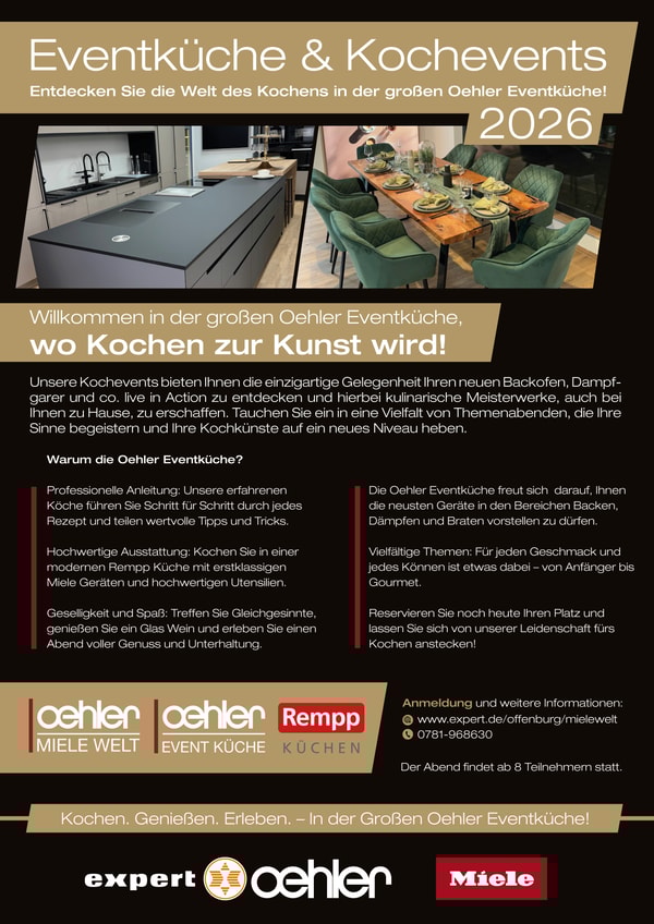 Seit dem 10. Juni 2024 ist expert Oehler in Offenburg um eine weitere Attraktion reicher: In Zusammenarbeit mit unserem Partner, der renommierten Firma Rempp, dürfen wir Ihnen ab sofort unsere neue Eventküche vorstellen. Sie kann während unserer Events für Vorführungen genutzt werden und ist unser ganzer Stolz. Optisch ein Schmuckstück, funktionell extrem durchdacht und qualitativ kaum zu toppen: Sie werden von unserer großen Eventküche begeistert sein! Warum wir so sehr davon überzeugt sind? Weil wir unseren Partner, die Firma Rempp, sehr gut kennen! Schließlich hat sie ihren Standort ganz in der Nähe: nämlich im schönen Städtchen Wildberg. Mit unserer fachkundigen Beratung und unseren kundenfreundlichen Services sowie der herausragenden Expertise und dem Know-how der Firma Rempp sind wir in der Lage, nahezu alle Küchenwünsche zu erfüllen. So sieht eben echte Qualität aus dem Schwarzwald aus, der Region, die wir lieben und in der wir tief verwurzelt sind! Uns ist die Zusammenarbeit mit regionalen Partnern wichtig, und da die Firma Rempp zu den bekanntesten und besten Herstellern in Deutschland gehört, ist die Freude über unsere große Eventküche natürlich umso größer.