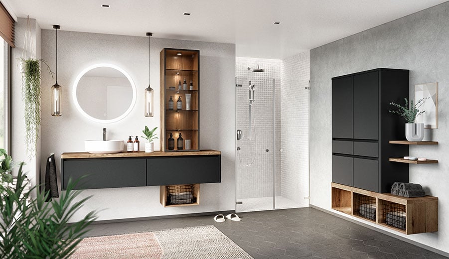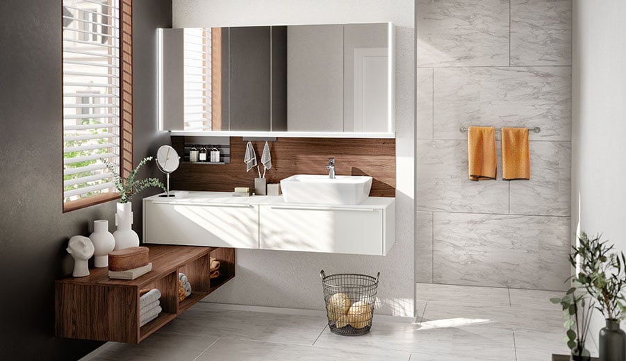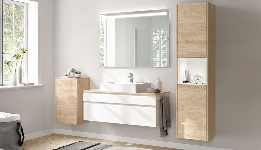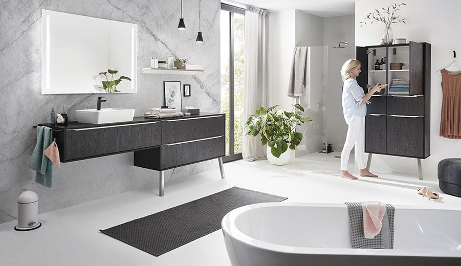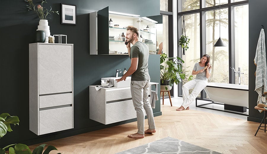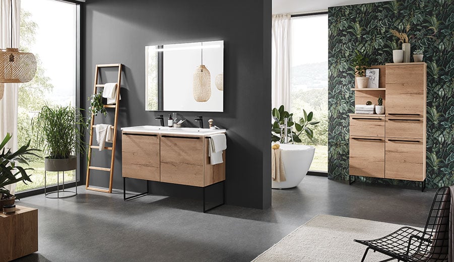 Damit dieser Ort auch für Sie zu einem ganz eigenen wird, bieten wir Ihnen hochwertig verarbeitete Badmöbel, deren Gestaltung von der Natur oder von aktuellen Trends des Interior Designs inspiriert sind. Sei es warme Holz-Optik, hochwertiger Schiefer, moderner Beton oder hochglänzende und matte Oberflächen: Für alle Ansprüche bieten wir ästhetische Designs mit individuellen Kombinationsmöglichkeiten. Damit Sie Ihre Zeit im Bad auch wirklich genießen können.