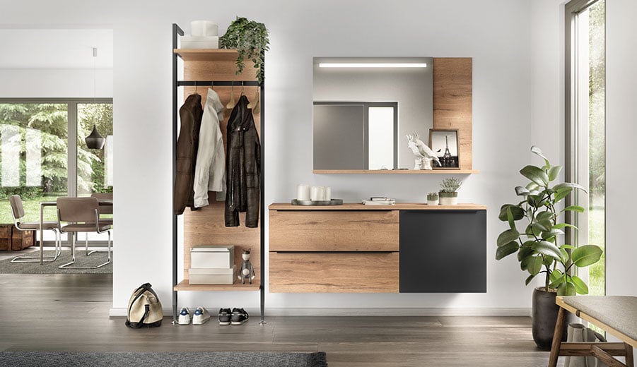 Diese Garderobe beweist ihr Organisationstalent täglich aufs Neue. Durch Ablageflächen, Auszüge und Kleiderstange hilft sie den Alltag zu organisieren. Praktisch, wenn Schlüssel und Handy griffbereit abgelegt werden können und Schal und Schirm ihren Platz finden. Und dann noch der rasche Blick in den beleuchteten Spiegel.