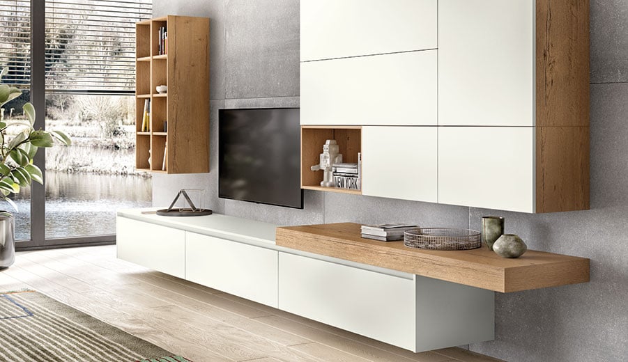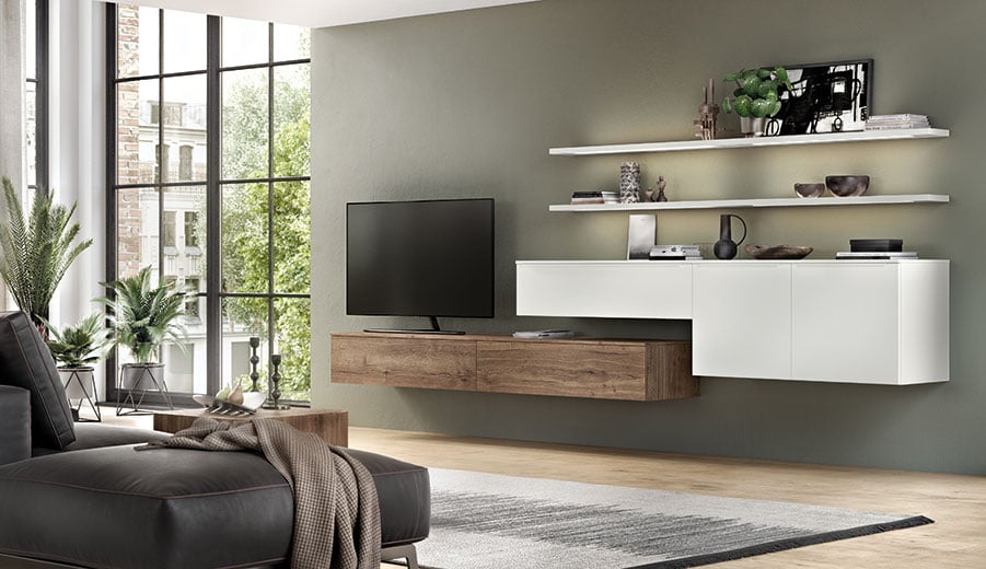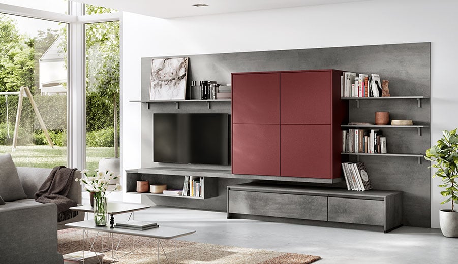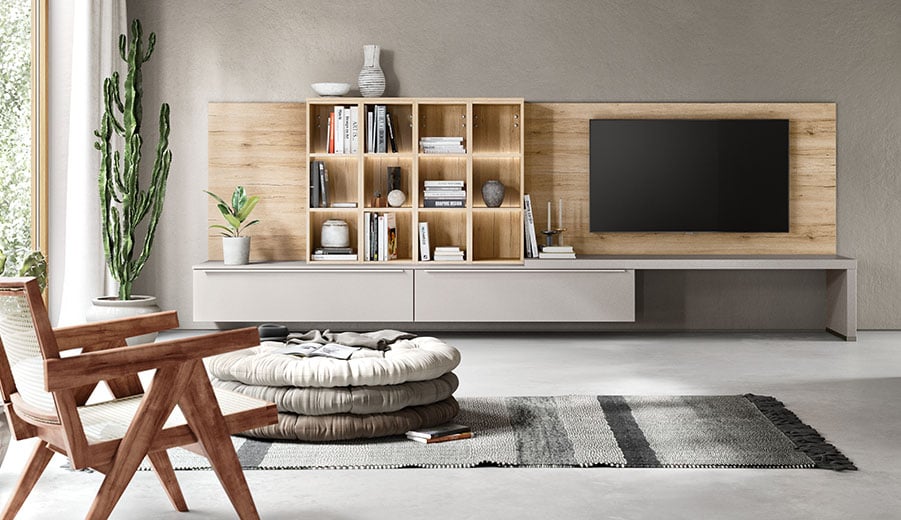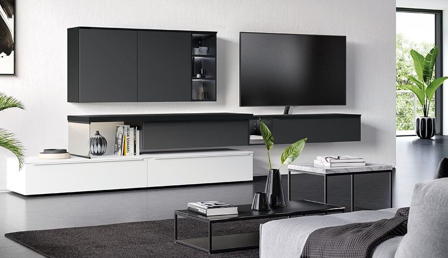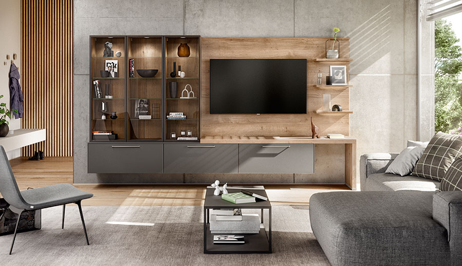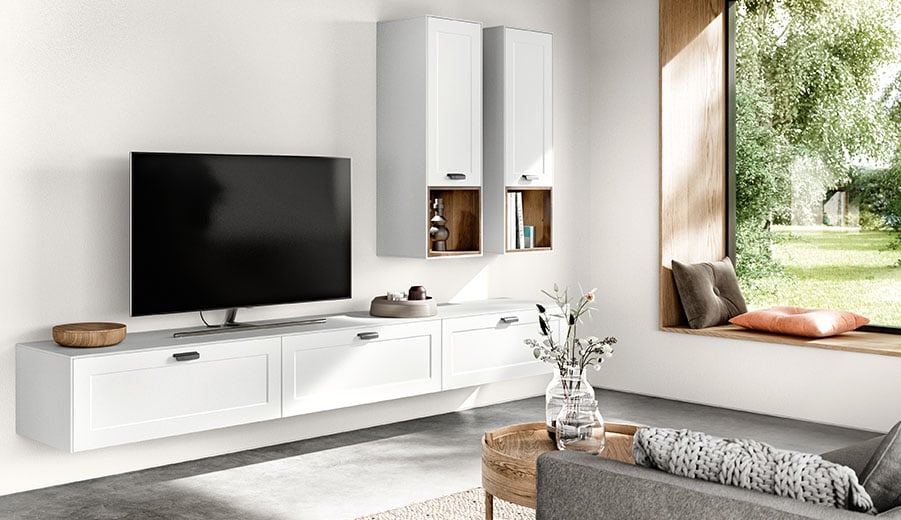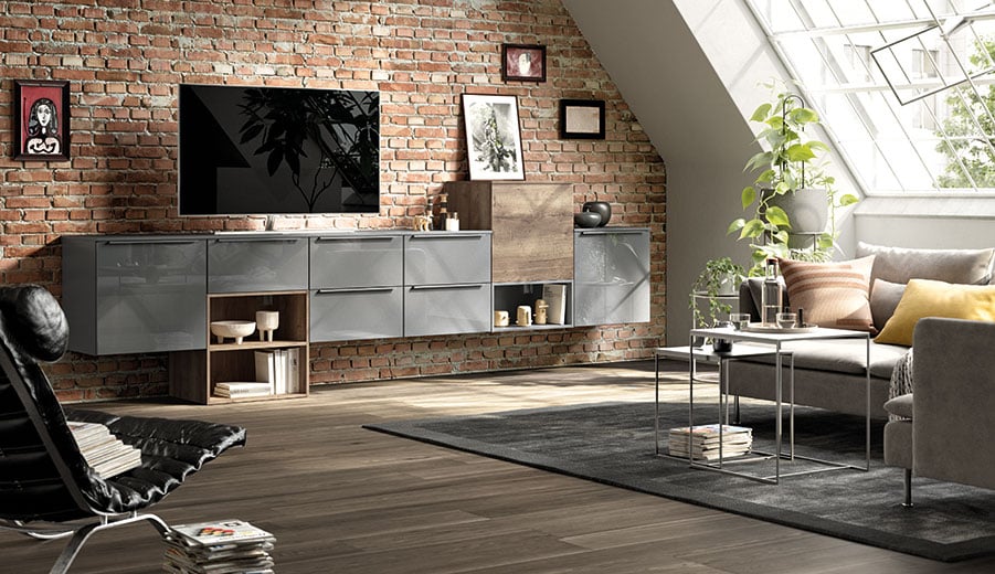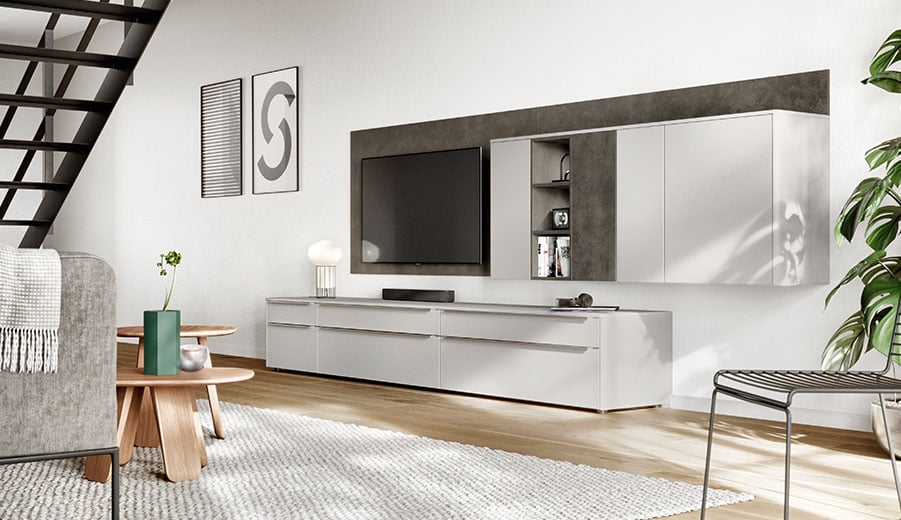 Dieses Sideboard-Arrangement wurde auf dem Boden stehend geplant, eine sehr zeitgemäße Interpretation zum Thema Stauraum. Für Harmonie sorgen seidengraue Elemente mit betont schlichten Griffen kombiniert mit der warmen Beton-Nuance Terragrau. Definitives Highlight im Wohnbereich: die runden Wangen.