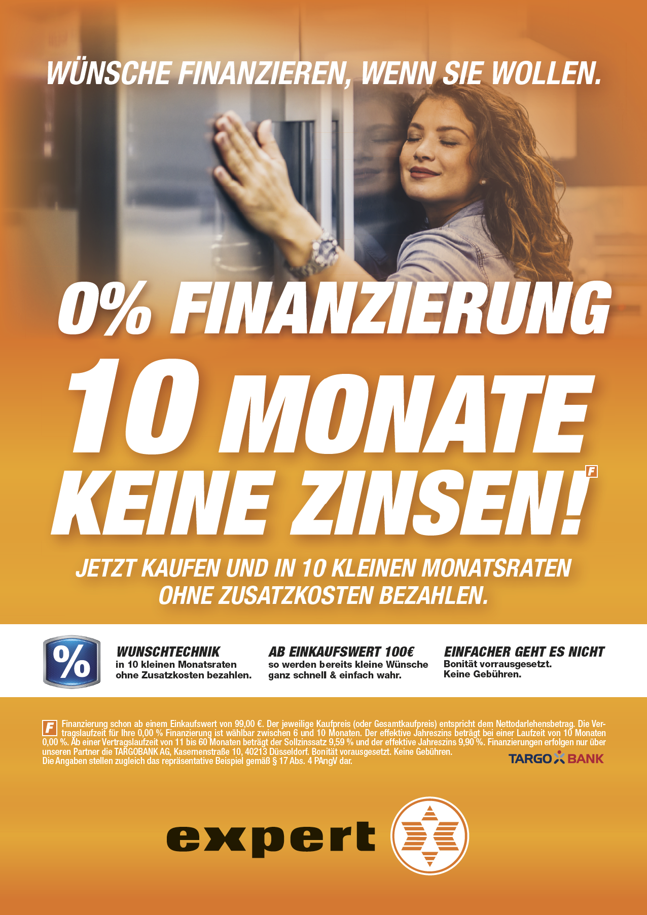 (F) Finanzierung schon ab einem Einkaufswert von 99,00 €. Der jeweilige Kaufpreis (oder Gesamtkaufpreis) entspricht dem Nettodarlehensbetrag. Die Vertragslaufzeit für Ihre 0,00 % Finanzierung ist wählbar zwischen 6 und 10 Monaten. Der effektive Jahreszins beträgt bei einer Laufzeit von 10 Monaten 0,00 %. Ab einer Vertragslaufzeit von 11 bis 60 Monaten beträgt der Sollzinssatz 9,59 % und der effektive Jahreszins 9,90 %. Finanzierungen erfolgen nur über unseren Partner die TARGOBANK AG, Kasernenstraße 10, 40213 Düsseldorf. Bonität vorausgesetzt. Keine Gebühren. Die Angaben stellen zugleich das repräsentative Beispiel gemäß § 17 Abs. 4 PAngV dar.