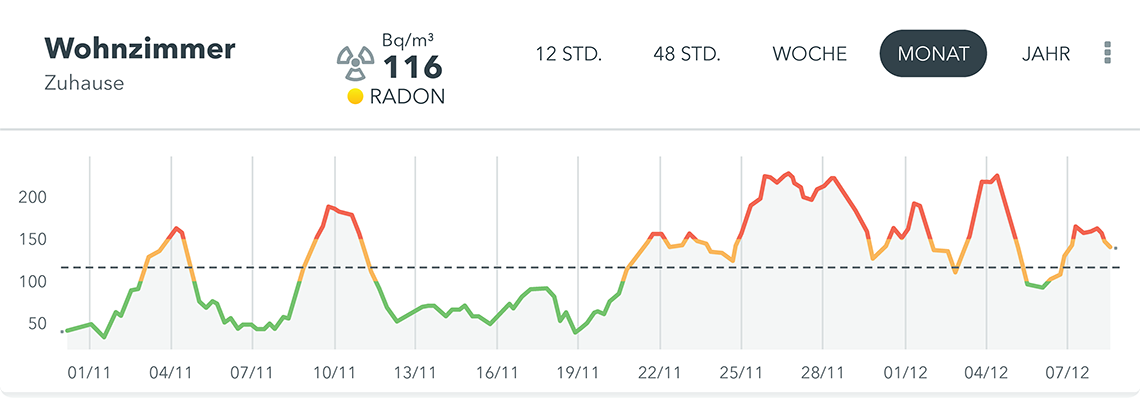 Aufgrund der schwankenden Eigenschaften von Radon ist eine langfristige, kontinuierliche Überwachung notwendig. Die Luftschadstoffe in Innenräumen variieren außerdem stark je nach Bewohnern und Belüftung sowie nach Inhalt und Nutzung des Raumes. Eine kontinuierliche Überwachung ist unerlässlich, um Tendenzen zu verstehen und die Belüftung zu optimieren und negative Auswirkungen auf Ihre allgemeine Gesundheit zu vermeiden.