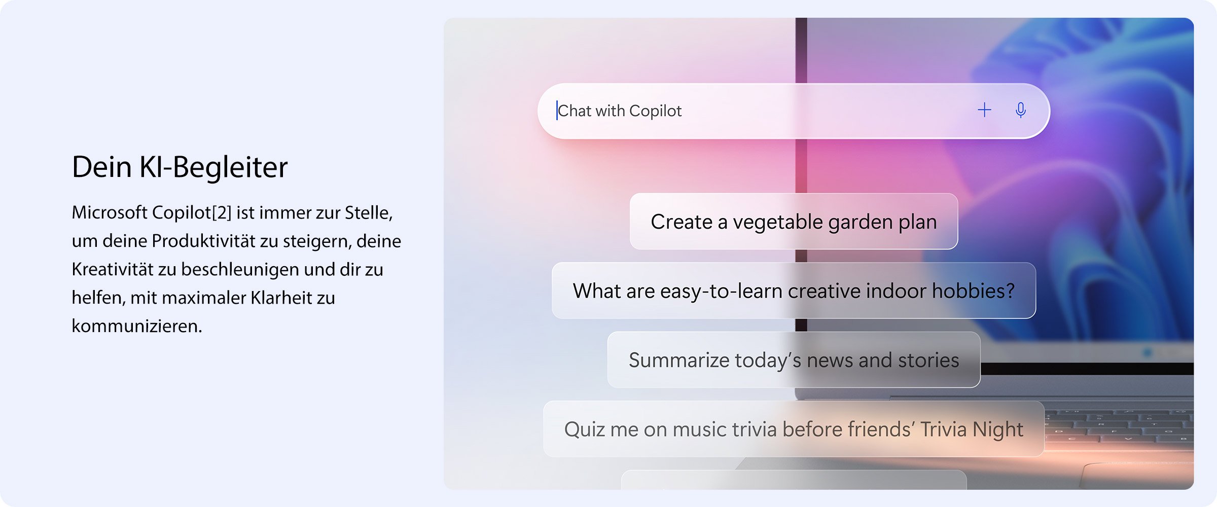 Die Suche in Windows 11 ist jetztKI-gestützt. Erhalte konkrete Antworten,Anregungen und Lösungen für deineFragen, Projekte und Aufgabenlisten.