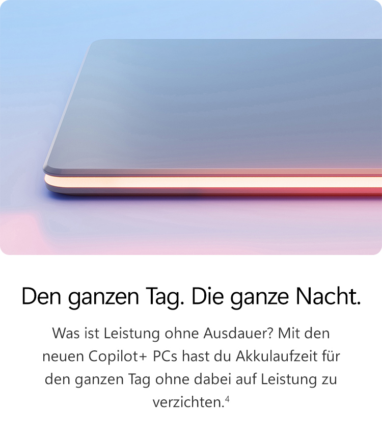 Willst du das ultimative Windows* erleben? Steige auf die neuen Copilot+ PCs um – die schnellsten und intelligentesten Windows-PCs aller Zeiten.