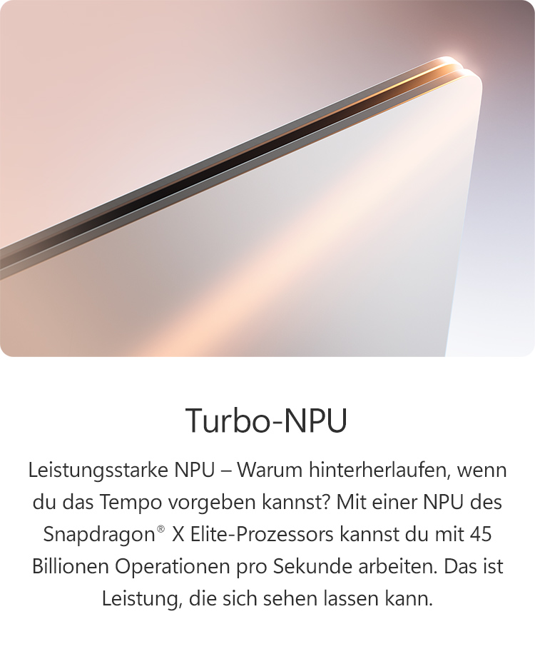 Warum hinterherlaufen, wenn du das Tempo vorgeben kannst? Mit einer NPU, die 40+ TOPs verarbeiten kann, stehen dir 40+ Billionen Operationen pro Sekunde zur Verfügung. Das ist Leistung, die sich sehen lassen kann.