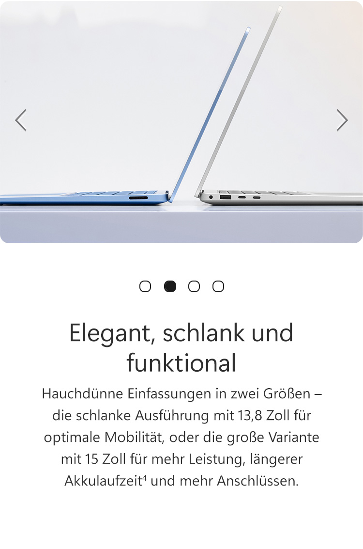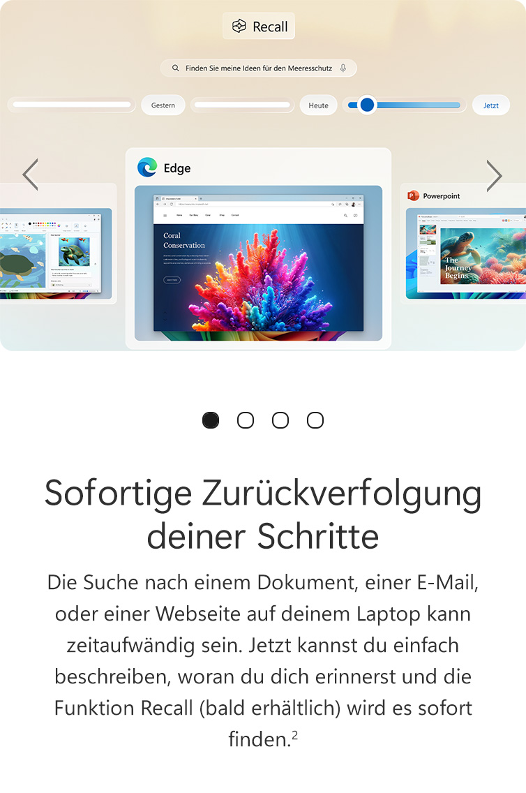 1. Auf einigen Geräten erfordern Copilot+ PC-Erlebnisse kostenlose Updates, die in diesem Jahr fortlaufend bereitgestellt werden. Der Zeitpunkt variiert je nach Gerät und Bereich. Siehe aka.ms/copilotpluspcs