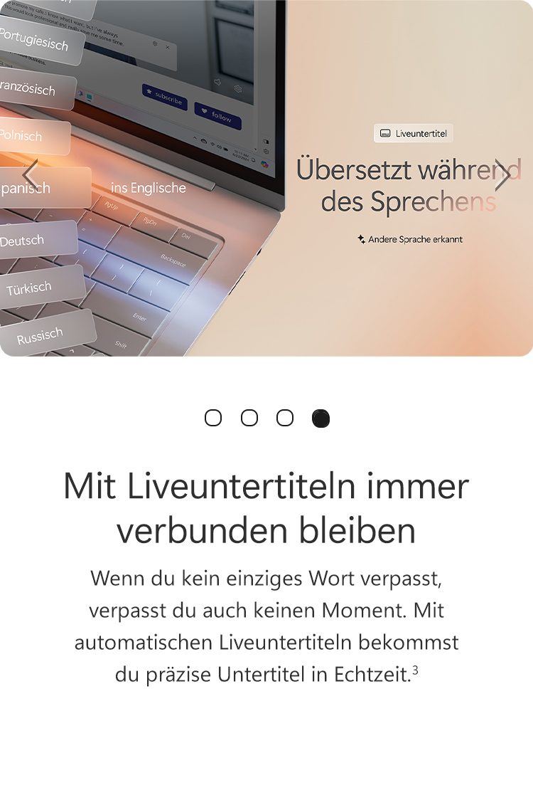 [3] Ünterstützt derzeit die Übersetzung von Video- und Audiountertiteln ins Englische aus über 40 Sprachen. Siehe https://aka.ms/copilotpluspcs