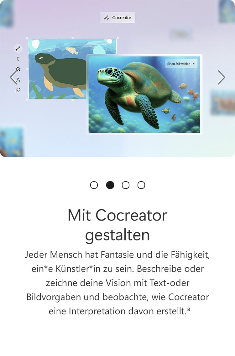 3. Optimiert für Text-Prompts in englischer Sprache. Erfordert ein Microsoft-Konto und eine Internetverbindung, um auf Cloud-Dienste zuzugreifen, die einen verantwortungsvollen Umgang mit KI ermöglichen. Siehe aka.ms/copilotpluspcs