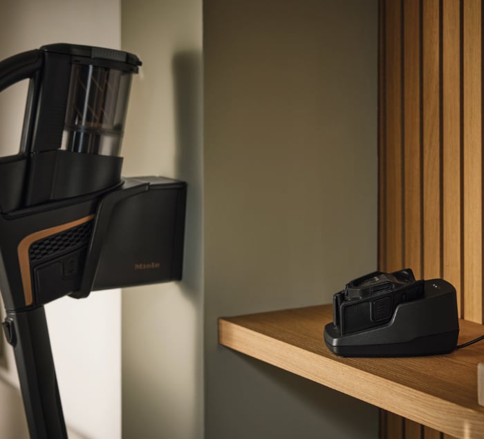 Laden Sie Ihren Miele Staubsauger Triflex und jetzt ganz komfortabel: Je nach individuellem Aufbaukonzept können Sie das Gerät sowohl mit der PowerUnit oben als auch mit der PowerUnit unten laden. Falls Sie die Wandhalterung nicht an die Wand bohren möchten, können Sie das Kabel auch direkt in den Akku führen. Am Abstellort Ihres Staubsaugers befindet sich keine Steckdose? Kein Problem – der Akku kann auch außerhalb des Geräts geladen werden.