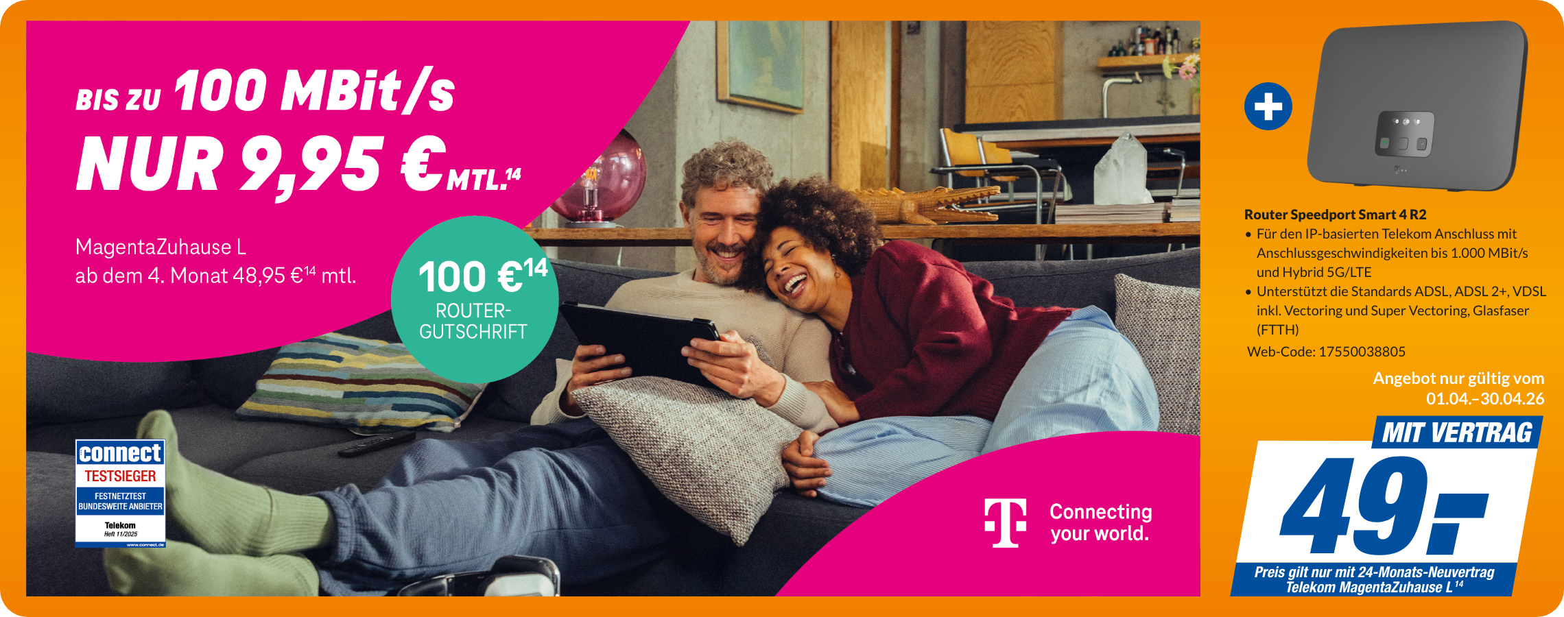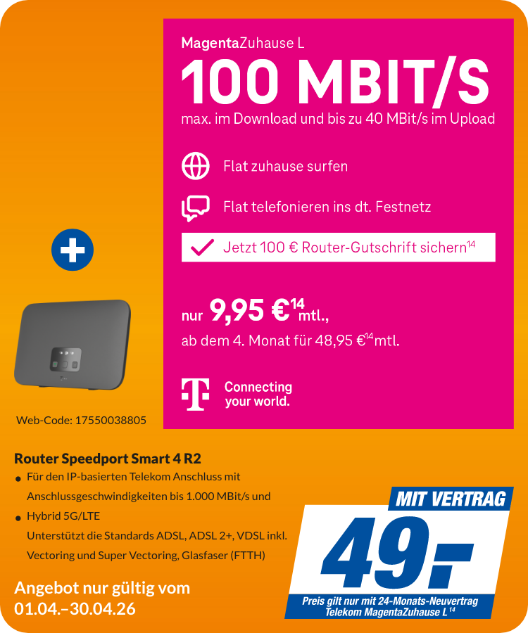14 Aktion gilt bis 30.06.2026 für Breitband-Neukunden, die in den letzten 3 Monaten keinen Breitbandanschluss bei der Telekom hatten. MagentaZuhause L kostet in den ersten 3 Monaten 9,95 €/Monat, danach 48,95 €/Monat. Bei Miete eines Routers im Endgeräte-Service-Paket (ab 6,95 €/Monat) erfolgt eine Router-Gutschrift i. H. v. 100 €. Hardware zzgl. 6,95 € Versandkosten. Einmaliger Bereitstellungspreis für neuen Telefonanschluss 69,95 €. Mindestvertragslaufzeit für MagentaZuhause 24 Monate, für den Router 12 Monate. MagentaZuhause L ist in vielen Anschlussbereichen verfügbar. Alle Preise inkl. der gesetzlichen MwSt.