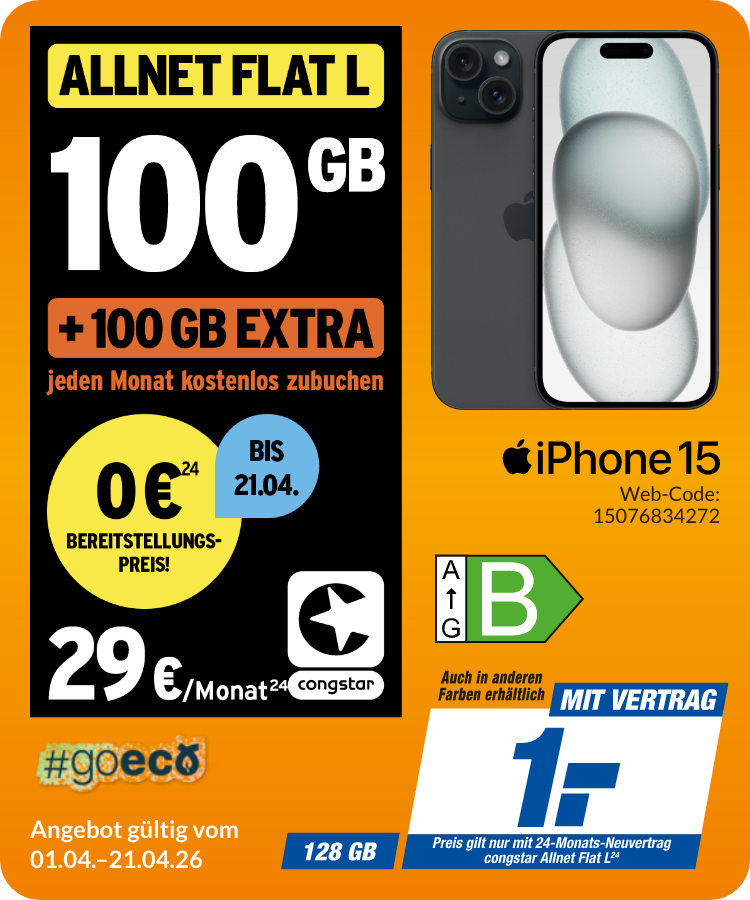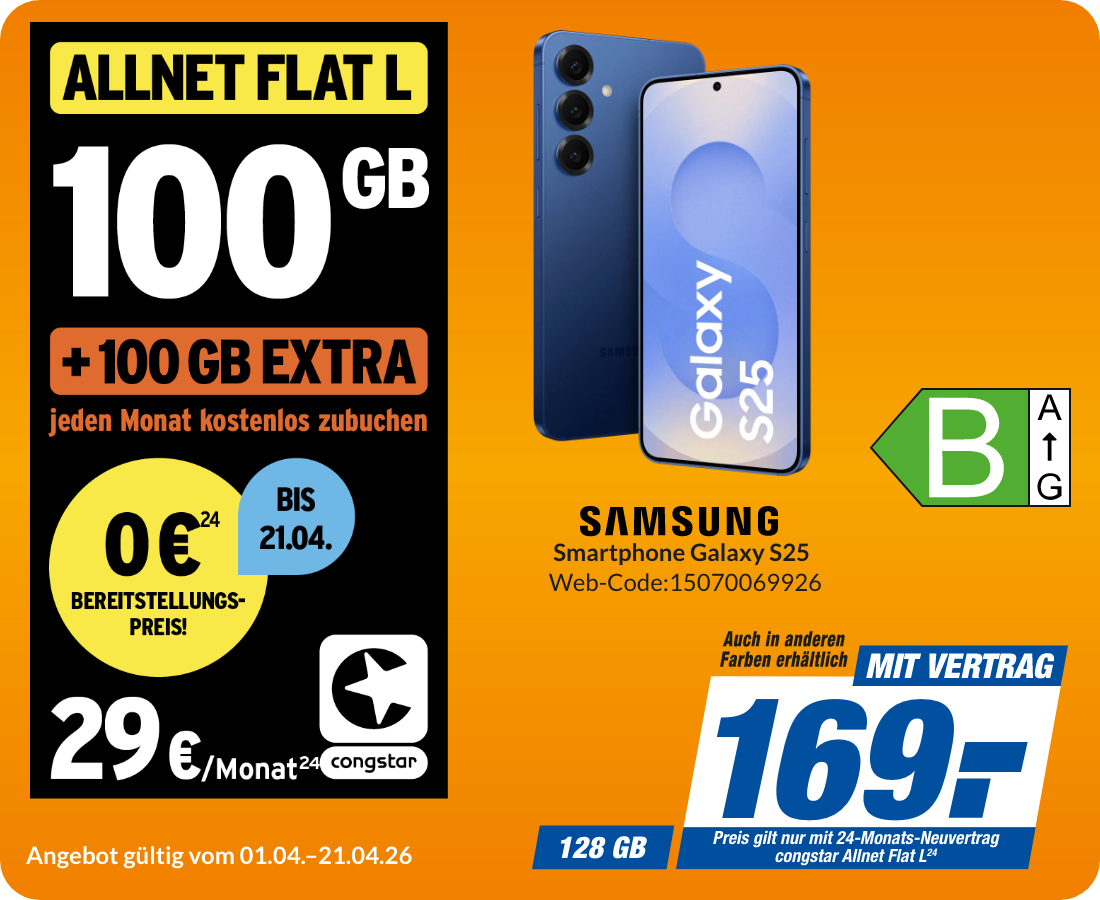 24 Aktion für Neukunden bei Buchung bis zum 21.04.2026: Die congstar Allnet Flat L mit GB+ kostet monatlich 29 €. Mindestvertragslaufzeit 24 Monate.